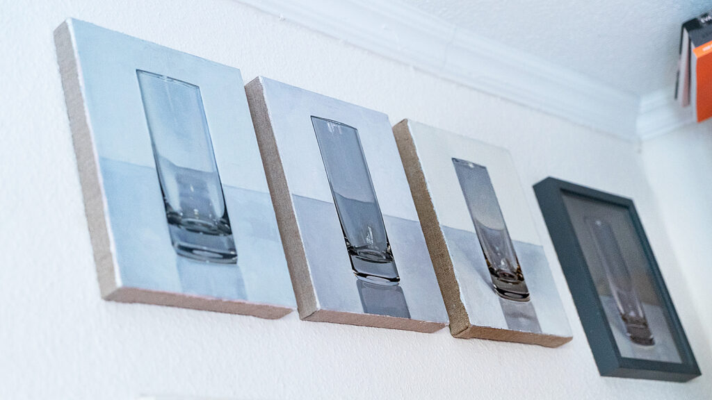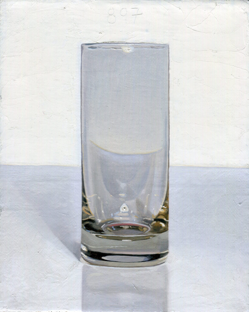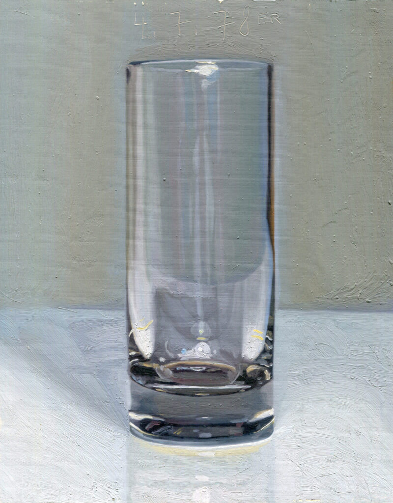 Peter Dreher war nicht ganz so radikal wie Erwin Hapke. Aber trotzdem hat er fast 40 Jahre lang in seinem Atelier im immergleichen Bildausschnitt immer wieder dasselbe Wasserglas gemalt, mal bei Tag, mal bei Nacht. Wir haben nicht nachgezählt, aber rund 5.300 Gläser-Bilder sollen so entstanden sein. Maximal 99 waren es pro Jahr.