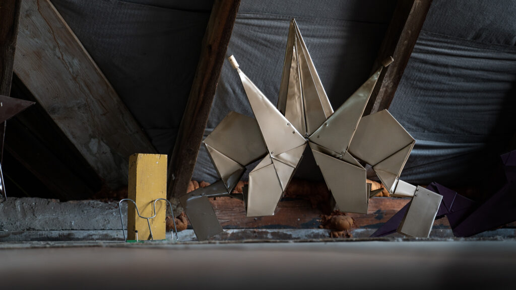 Wenn Gastro-Sammler Bloehme wie Norbert Schwontkowskis höchstes Wesen in unserer Ausstellung zu „Werden & Vergehen“ aus dem Bibliotheks-Fenster guckt, dann sieht er nicht wie Schwontkowskis Wesen in Frans Roermonds Loch, sondern auf eine Blech-Skulptur von Erwin Hapke, dessen Reich wir als erste und letzte Aushäusige vor unseren Augen haben auferstehen und untergehen sehen.