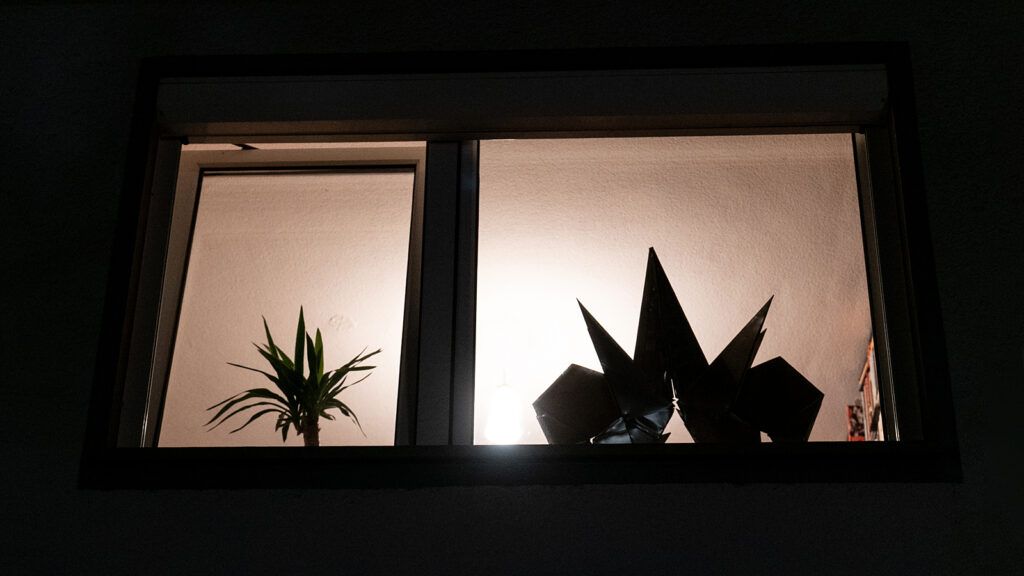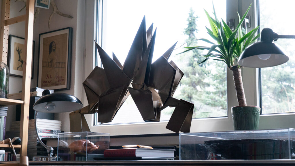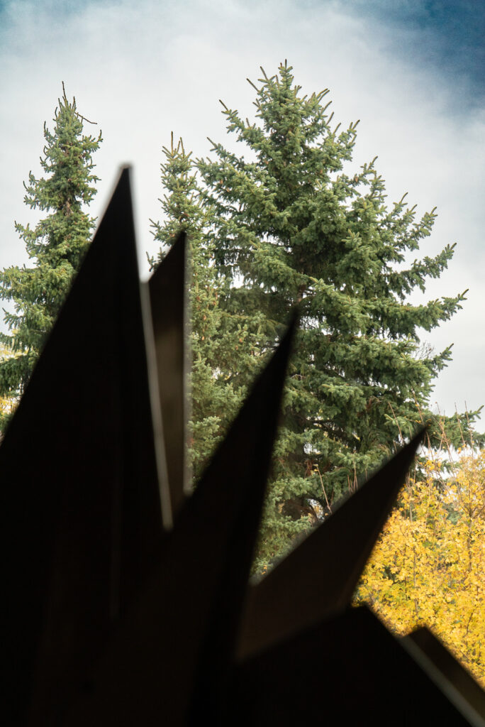 Foto: Blick aus dem Bibliotheks-Fenster der Sammlung Bloehme, vorbei an Erwin Hapkes „Krabbe“, Hamm 2025