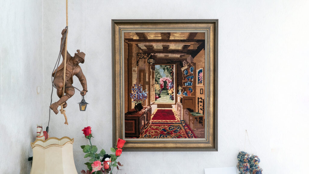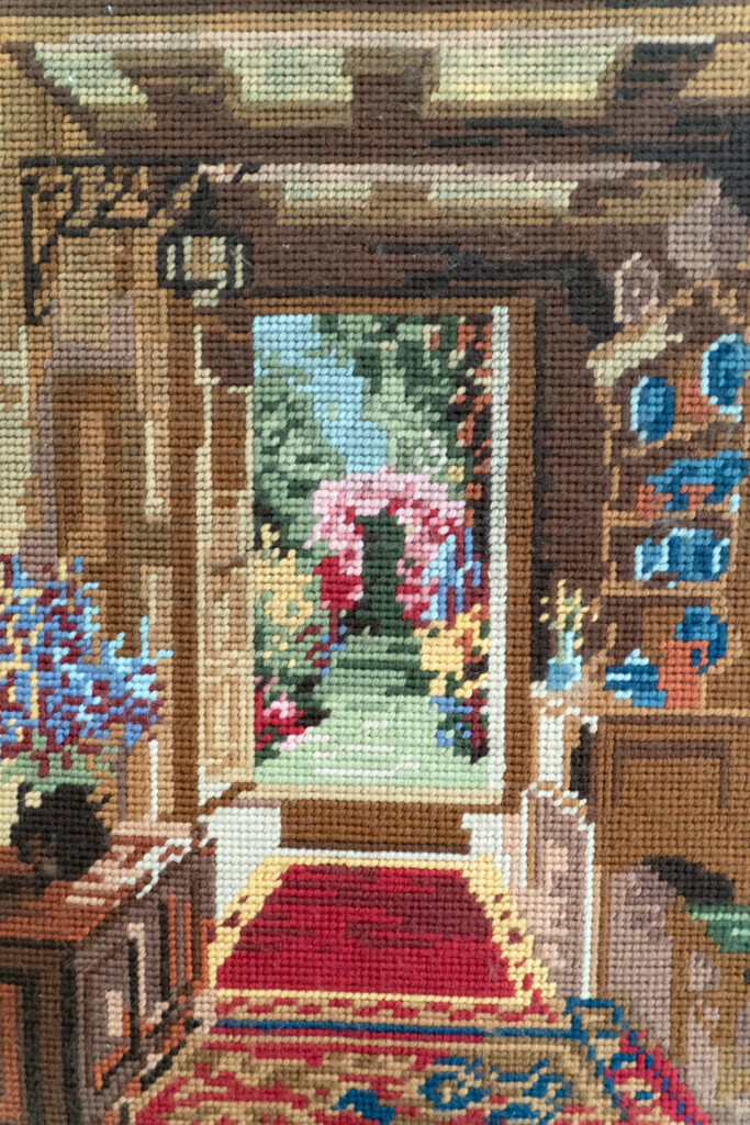 Knüpfarbeiten zum Beispiel nach Kunstmotiven, die mit einer speziellen Nadel durch ein „Stramin“ genanntes Baumwoll-Raster gezogen werden mussten.
