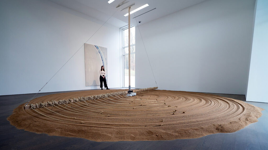 Bestes Sinnbild hierfür ist in unseren Augen die „Sandmühle“ (1969/2014), die im Arp Museum jetzt ihre Furchen durch einen fruchtlosen Rund-Acker aus Mineralkörnern zieht – ganz ohne Esel oder vielleicht ja sogar glücklichen Sisyphos. Sehr reiche arte povera.