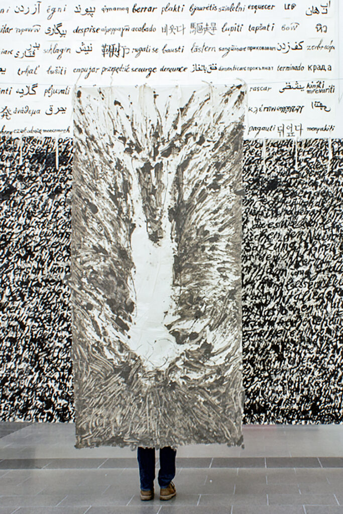 „Brief an Peking“ (1994), mit der Günther Uecker halb unter Farbe verborgene Worte der Menschenrechtserklärung per Ausstellung trojanergleich nach China schmuggelte.