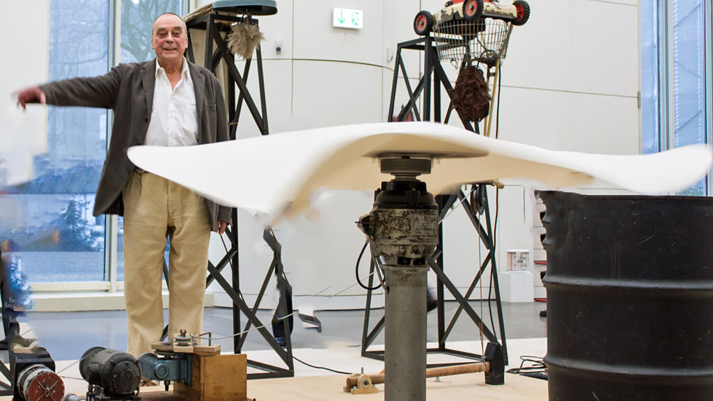 Er dirigierte seine Plastik „New York Tänzerin“ (1962), deren – natürlich von einem Nagel! – auf dem Motoren-Sockel gehaltenes Tuch per Fußdruck wirbelnd in die Lüfte abhob wie ein Derwisch.