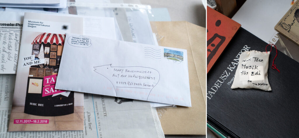 Danach begegneten wir Takako Saito jahrelang nur über Bande, teils über Spuren. Einmal kaufte das Kunstmuseum Bochum ein Porträtfoto an, das wir in Siegen von ihr im (ebenfalls vom Museum angekauften) Klang-Kleid gemacht hatten, ein andermal lag auf dem Schreibtisch von Mary Bauermeister in Rösrath neben einem alten Ausstellungs-Flyer einer ihrer vielen Briefe.