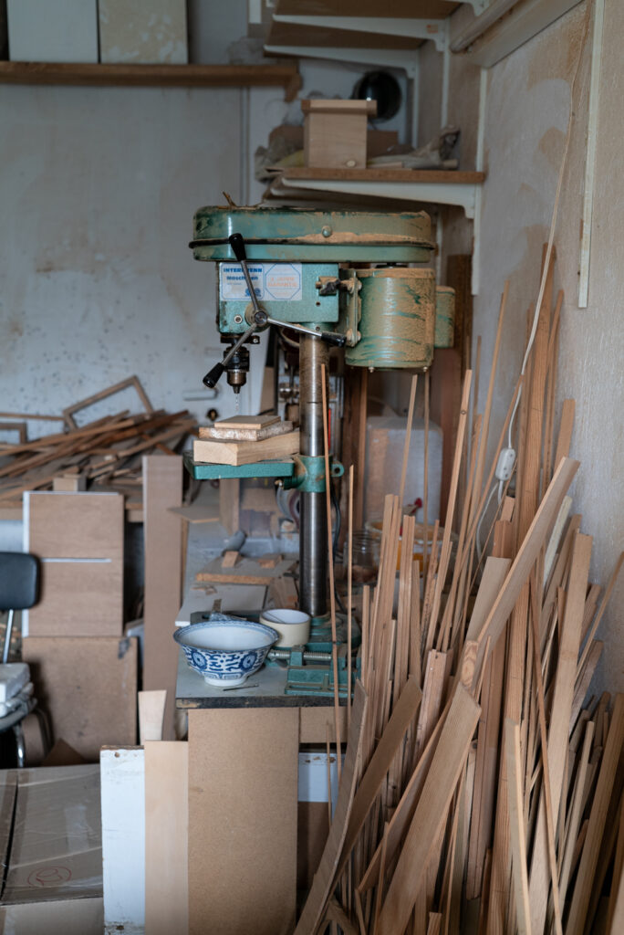 Eine Ständerbohrmaschine und ein Bandschleifer war darunter, eine elektrische Dekoupier- und eine Tischkreissäge, aber das beschreibt nicht im Ansatz die Fülle im Atelier, die hoffentlich unsere Bilder vermitteln. Denn Takako Saito hatte alles selbst gemacht.