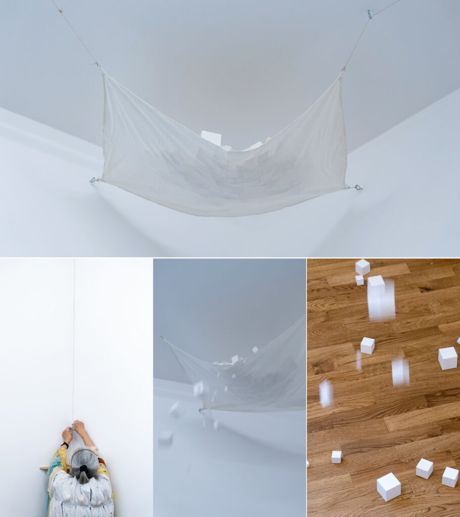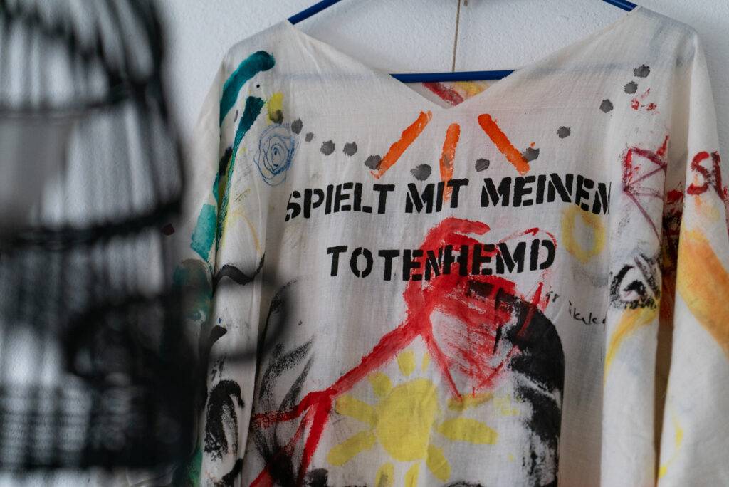Und als wir 2023 im Wohn-Atelier des kurz zuvor verstorbenen Künstlers Eduard „Edi“ Roijen in Düsseldorf Knochenwesen für ein Foto-Buch fotografierten, lag da ein Kunstwerk, das Takato Saito ihm gewidmet hatte: „Drei Töne Musik für Edi“ von 1999 – ein halbdurchsichtiger weißer Stoffsack mit rotem Band, der mit Takato Saitos typischen Papierwürfeln gefüllt war.