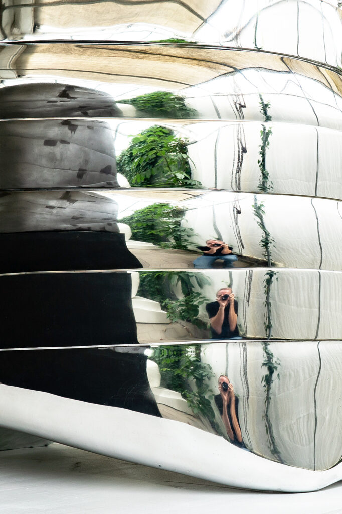 Bei Hede Bühl waren wir im Sommer 2020 im mit hohen Mauern umfriedeten Atelier, genau zwischen zwei Lockdowns während der Corona-Pandemie. Die damalige Direktorin der Villa Zanders, Petra Oelschlägel, hatte uns den Besuch – und uns selbst dann später auch bei Hede Bühl – empfohlen.